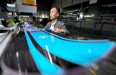 4月24日,在翔瑞驰公司生产车间,工人在生产的滑雪板上打标。该公司生产的雪板、雪鞋、固定器等产品已经出现在多个国际冰雪赛事上。