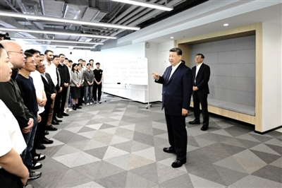 “模速空间”是上海市打造的人工智能大模型专业孵化和加速平台,已入驻企业100余家。习近平来到这里,通过视频短片了解上海市人工智能产业发展情况,察看重点孵化企业的大模型产品展示,听取相关技术研发和企业生产经营介绍。习近平对上海积极发展人工智能取得的实效给予肯定。他指出,人工智能技术加速迭代,正迎来爆发式发展,上海要总结好以大模型产业生态体系孵化人工智能产业等成功经验,加大探索力度,力争在人工智能发展和治理各方面走在前列,产生示范效应。