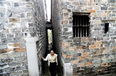 屋顶,四周有三层突出檐梁,一层比一层外凸,线条笔直;正墙,不时伸出个墙垛似的小耳檐,就像顽皮的孩子,偷偷伸长脖颈看稀奇;砖与砖的缝隙很小,貌似糯米勾缝;屋后排水沟,两块或三块条石砌成,高深、牢固、齐整,丝毫看不出松动迹象。
