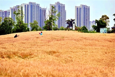 近日,位于四川省成都市龙泉驿区大面街道境内的麦田景观吸引民众打卡拍照。进入夏天,成都环城绿道两旁的麦子成熟待收,变成金黄色,成为近郊一道靓丽风景。
