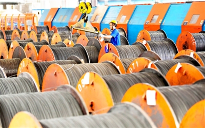 日前,嘉鱼县官桥镇湖北欧维姆缆索制品有限公司车间,工人们正在吊装刚生产出来的缆索。该公司现有3个生产车间,今年一季度产值已突破9000万元,全年产值有望达到4.6亿元。