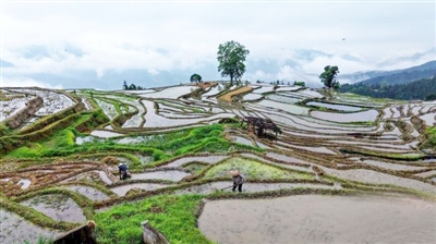 近日,广西桂林市龙胜各族自治县泗水乡泗水村小岩底屯绵延的云海如波涛般翻涌,与当地错落有致的民居、明如镜面的梯田交相辉映,勾勒出一幅流动的田园画卷,美不胜收。