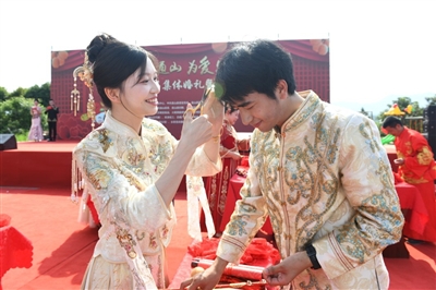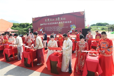 活动现场,20对新人身着华服,在亲朋好友和现场观众的祝福声中,共同开启了幸福的人生旅程。婚礼仪式遵循传统礼仪,掀盖头、拜天地、夫妻对拜等环节依次进行。金婚、银婚夫妇上台为新人赠予枇杷香囊、鲜花,祝福新人婚姻美满、幸福长久。