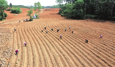 近日,咸安区汀泗桥镇马鞍村,丰诚源(湖北)农牧有限公司的红薯基地里,一条条新翻耕的土垄松软规整,村民们正熟练地扦插红薯苗。该基地种植淀粉薯600余亩,带动周边30余名村民参与种植管理。