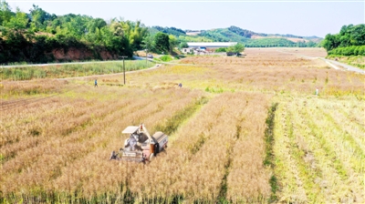 近日,咸安区向阳湖镇广东畈村八组,农机手驾驶着收割机在连片的油菜基地里抢收油菜。去年10月,该村完成386亩高标准农田建设,通过让田块“小变大、陡变缓、散变聚”,提高生产能力和经济效益。