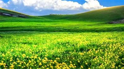 近日,新疆塔城地区裕民县的吐尔加辽草原风景如画。草原像是一块巨大的绿色绒毯,一直延伸到天际。草原上,五颜六色的野花竞相绽放。(本报综合)