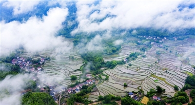 近日,在安徽省宣城市旌德县白地镇汪村,村民抢抓农时对高山梯田进行蓄水插秧。层层叠叠的梯田、错落有致的民居在云海掩映下若隐若现,美不胜收。