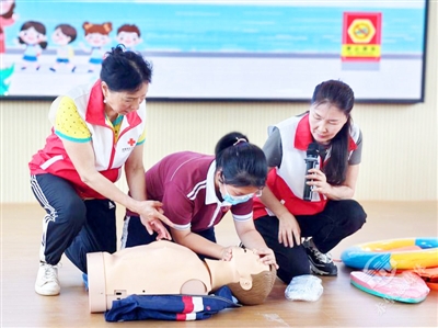 活动现场,志愿者向师生发放防溺水宣传手册,讲解员结合车埠镇水域特点,借助动画视频,详细讲解溺水风险行为、自救和救援知识,展示游泳安全器材使用方法,并重点强调了防溺水“七不两会”原则。在急救技能教学环节,讲解员借助模拟人道具,现场演示了心肺复苏术,分解动作要领,指导学生进行实操,让学生慢慢掌握急救技能。
