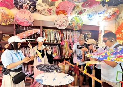 每到一处,采访团记者们都用手中的笔和相机,记录下古镇承载的特色文化和经营发展现状,与非遗油纸伞传承人、旅拍店主、青砖茶技艺大师、文旅部门相关负责人等深入交流,力求多维度展现赤壁青砖茶的“前世今生”。更有记者兴致勃勃地换上汉服和特色民族服饰,以第一视角表现古街风貌,展开生动有趣的报道。