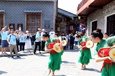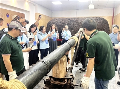 采访团一行先后参观羊楼洞明清石板街、赵李桥砖茶制作技艺传承馆、中国青砖茶博物馆等地,穿梭于沿街非物质文化遗产项目特色商铺、创意旅拍店、青砖茶馆等,近距离观看赤壁脚盆鼓表演,观摩体验青砖茶制作流程,沉浸式了解赤壁青砖茶深厚的历史文化底蕴、古法制茶技艺传承与创新、非遗文化传承保护等。