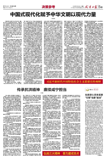 大别山精神、抗洪精神、抗疫精神“三大精神”,是我们党和国家的宝贵精神财富,其锐意进取的历史实践曾由湖北人民开拓,其团结奋斗的精神力量更在荆楚大地凝结。人无精神则不立,国无精神则不强。在湖北加快建成中部地区崛起的重要战略支点、奋力谱写中国式现代化湖北篇章之际,我们要继续弘扬“三大精神”。咸宁作为“三大精神”之一的抗洪精神重要发源地,尤其要深刻把握抗洪精神内涵,深度串联咸宁精神内核,深深扎根咸宁当地实践,抓住历史发展机遇,加快打造武汉都市圈绿色发展重要增长极,筑牢咸宁高质量发展精神堤坝。