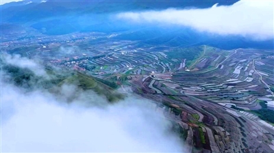 六月中旬,新雨初歇,兰州榆中县的梯田自山脚叠起,直向云端。层叠的曲线之上,云烟正悄然流淌,朦胧间梯田宛如半浸在流动的乳色水镜之中,倒映着天光云影。 |
