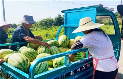 在瓜田里,十余名村民顶着烈日辛勤劳作。他们分工有序,有的细心地为西瓜覆盖稻草,防止烈日灼伤;有的则熟练地采摘符合标准的西瓜,稳稳码放在运输车上。这些西瓜重量在5—10公斤之间,是名副其实的“大块头”。