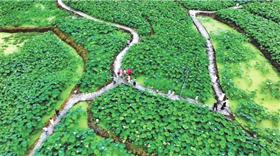 夏至时节,通山县南林桥镇石门村的百亩荷塘迎来盛景。接天莲叶碧波荡漾,粉莲、红台莲亭亭玉立,蜻蜓点水,微风送香,游人沉醉于蜿蜒栈道间。