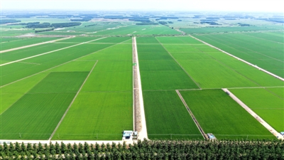 这是6月24日在黑龙江北大荒农业股份有限公司八五六分公司第六管理区高标准农田拍摄的水稻秧苗(无人机照片)。