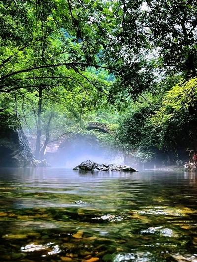 6月21日,武汉游客赵琼踏入这片山林,潺潺溪流如灵动的琴弦,奏响着夏日的清凉乐章。只见溪水清澈见底,在阳光的轻抚下,闪烁着细碎的银光,像是撒了一池的星星。