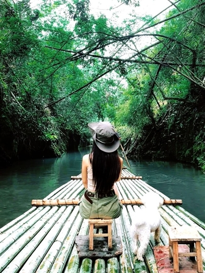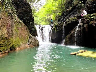 大家穿戴好安全防护装备,跳上摇摇晃晃的青竹筏,老船工用竹竿轻点水面,筏子便载着大家滑进峡谷深处。藤蔓像绿色瀑布般垂落,偶尔有调皮的水珠滴在脖颈,凉得人打个激灵。