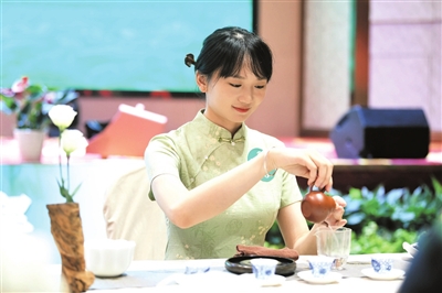 制茶项目比赛现场,片片嫩绿的茶叶经过制茶师傅娴熟的揉、捻、拍等手法后逐渐成形,茶香四溢,观众驻足,亲眼见证一片茶叶的制作过程,感受手工制茶的魅力。