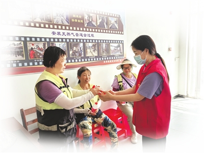 在温泉街道中心花坛邻里驿站,记者看到环卫大姐们围坐休息,桌上冰镇酸梅汤冒着凉气。邻里驿站不仅提供急救药品,更配备了电视报刊,让短暂休憩也能有滋有味。