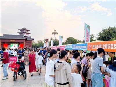 公园两侧,摊位林立,人潮涌动。文明集市活动设置摊位33个,内容涵盖抗洪精神宣讲、移风易俗宣传、文化惠民、家电补贴政策宣传、农业技术咨询、科学技术普及、法律知识普及及援助等。