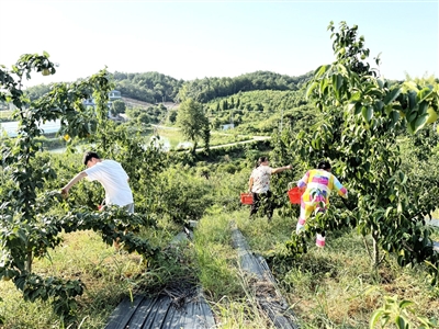 7月10日,咸安区向阳湖镇广东畈村的尚屋朱农果采摘园里热闹非凡,挎着果篮的村民与游客往来如织,欢声笑语间果香四溢。