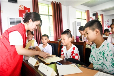 7月16日,咸安区汀泗桥镇聂家村村委会的暑期“爱心托管班”上,来自武汉科技大学暑期社会实践团队的大学生志愿者在课堂上和孩子们互动。 记者 陈红菊 特约记者 李婷婷通讯员 朱华芮周琪摄