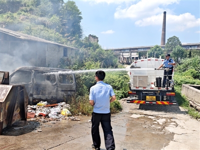 面对危急情况,带队民警边紧急调派洒水车增援,边迅速疏散围观群众。没一会儿,洒水车呼啸而至,民辅警们迅速接好水管,全力灭火。经过十多分钟的奋力扑救,明火最终被扑灭。为确保万无一失,民辅警们又仔细检查了现场每个角落,确认没有复燃可能后才放下心来。