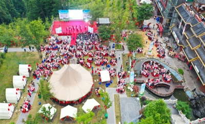 下午6时许,山间云雾犹如帷幕般缓缓散去,拉开了千人宴的序幕,特色美食与精彩表演为广大游客带来一次酣畅淋漓的感官体验。