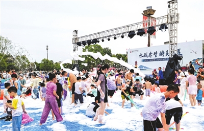 活动当天,游客们化身三国勇士,持水枪水盆在战鼓声中“攻伐”“结盟”。大乔、小乔与傣族姑娘等 NPC(非玩家角色)穿梭互动,战场水花四溅,“冲杀”声此起彼伏。暮色中,巨型泡泡机喷涌出漫天“雪浪”,将激战推向高潮。“带三个孩子来这里放松,咱赤壁以‘火’闻名,这场‘水战’又新又燃!”一位游客的赞叹道出众人心声。