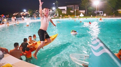 水晶谷梦幻水世界毗邻滑雪馆,推出暑期畅玩卡,结合水上滑梯、泳池派对等项目,形成“滑雪+玩水”联动体验。烟花电音节上,DJ音乐与水上项目交织,游客黄睿谦兴奋地说:“沙滩派对和乐队演出氛围拉满,烟花秀更是浪漫暴击!”