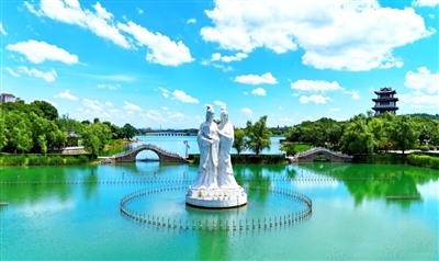 二乔公园是三湖连江风景带上最具代表性的景点。公园依山傍水,亭台楼榭、曲水回廊错落有致。被水帘包裹的二乔雕塑端庄娴静,一袭长白袍,在阳光下熠熠生辉。