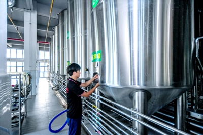 8月21日,咸宁高新区蜗牛角(湖北)食品酿造有限公司生产车间内,工作人员正在检查设备,确保生产稳定运行。