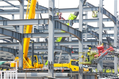 9月4日,通山电子信息产业孵化园项目现场,工人们从不同作业面开展钢结构厂房的架设作业,一派热火朝天景象。