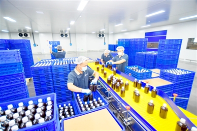 8月28日,湖北嘉悦生物科技有限公司生产车间内,一瓶瓶液态饮料从流水线上下线,工作人员一丝不苟地检验装箱。