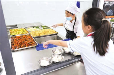 “菜我全都要!”9月11日下午5点20分,赤壁市中伙铺镇中学下课铃声刚落,九年级学生舒安琪欢快地奔向食堂窗口。按照她的要求,食堂阿姨将牛肉炒香芹、辣椒炒肉片、胡萝卜烧肉、清炒油麦菜、黄瓜、土豆丝等6个菜打入餐盘,盛得满满当当。另外,还给她盛了一小碗蛋汤。