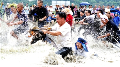 9月23日,在贵州省榕江县三宝侗寨举行的2025年中国农民丰收节分会场活动上,人们在参加捉鸭比赛。