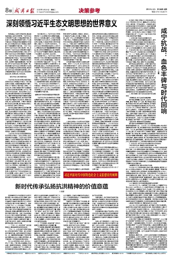 硝烟虽远,精神长存。从武汉会战的战略支点到鄂南游击战的坚强堡垒,从四行仓库的“八百壮士”到何功伟“绝不回头”的凛然气节,抗战精神已深深融入咸宁城市血脉,成为推动城市建设的精神动力。当前,咸宁正处在打造武汉都市圈绿色发展重要增长极的关键阶段,正需继承抗战精神遗产,以爱国情怀凝聚高质量发展的精神共识,以民族气节筑牢文化自信的精神根基,以英雄气概激发创新的内生动力,以必胜信念铸就绿色崛起的城市品格。 (作者单位:湖北科技学院)