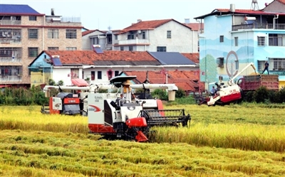 近日,咸安区高桥镇大堰口的中稻迎来丰收季,农机手们驾驶农机正在收割水稻,田间地头一片繁忙景象。