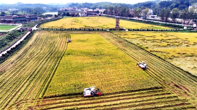 多台联合收割机在阡陌间往来穿梭,农机手们熟练操控着机器吞穗吐粒,饱满的谷粒如金色瀑布般倾泻进运输车斗,轰鸣的机械声与欢快的丰收笑语交织成秋日最美的田园交响曲,勾勒出乡村振兴的生动图景。