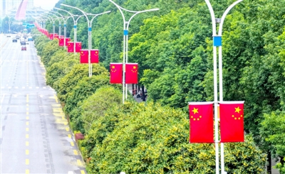 与此同时,1345面鲜艳的五星红旗已在咸宁大道、银泉大道、桂乡大道等主干道旁统一悬挂,一抹抹“中国红”格外耀眼,成为一道亮丽的风景线。