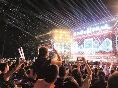 “我和我的祖国,一刻也不能分割……”10月1日晚,月亮湾街区音乐节现场,万人齐唱《我和我的祖国》,红旗与荧光棒交织成红色海洋。
