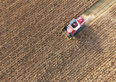 10月11日,在位于黑龙江省肇东市的北大荒集团四方山农场有限公司,机械设备在进行玉米收获作业(无人机照片)。