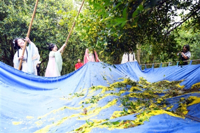 近日,在咸安区桂花镇,游客们手持长杆,感受打桂花的乐趣。随着竹竿的敲打,金黄色的花瓣簌簌落下,仿佛下起了一场“黄金雨”,烂漫的笑颜掩映在葱茏的桂花林里,桂香浮动间,构成了一幅绝美的秋日图景。