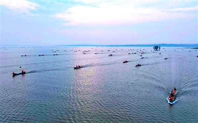 开湖首日,几十艘渔船拔锚起航,驶向薄雾笼罩的湖面。经过7个月的禁渔期,斧头湖再次向渔民敞开怀抱。码头上,新修建的集中销售区井然有序,30个标准化摊位依次排开。