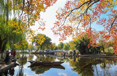 11月12日,游客在南京莫愁湖公园赏景游玩。