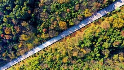 11月16日,潜山国家森林公园层林尽染。漫山的林木褪去翠绿,迸发出红、黄、橙、紫等多重色彩,似大自然肆意挥洒的调色盘。市民三五成群,或悠然漫步,或驻足赏景,沉醉在这如诗如画的美景之中。 记者 夏正锋 摄