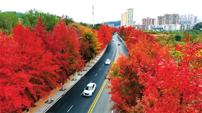 眼下正值枫叶观赏期,在市区孟养浩东路,道路两旁的枫树已悄悄染红,层层叠叠的枫叶在阳光照射下,呈现出绚丽夺目的色彩,勾勒出一幅诗意盎然的“枫景”,吸引众多市民游客打卡拍照。记者 赵忠志 摄