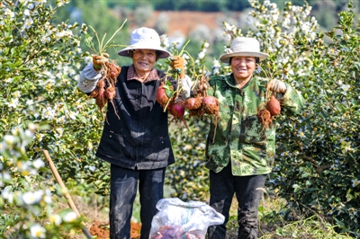 11月13日,笔者来到嘉鱼县官桥镇官桥村湖北种乐园生态农业发展有限公司的万亩山茶基地,放眼望去一片花海,朵朵白花开满枝头。茶花下,20多名农民正在挖红薯,呈现一幅美丽的秋收画卷。