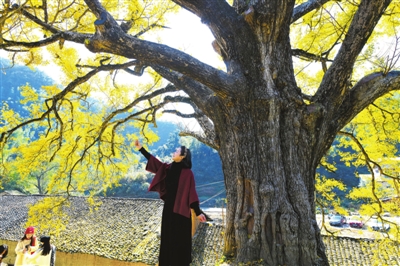 初冬时节,通山县大路乡界水岭村程家垅自然湾,树龄逾八百年的“银杏王”满枝金黄,与村落相映成景,吸引众多游客前来打卡。