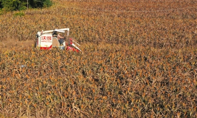 11月21日,咸安区向阳湖镇祝垴村,新农人王吉正利用联合收割机收割成熟的第二茬再生高粱。